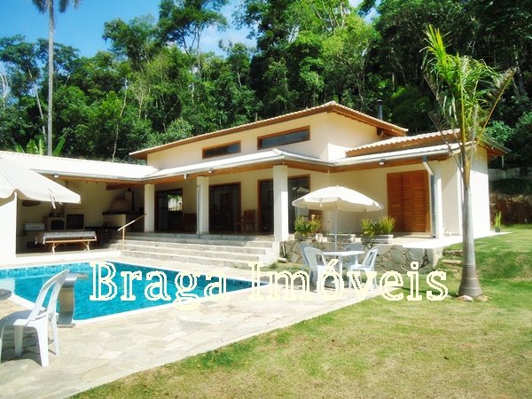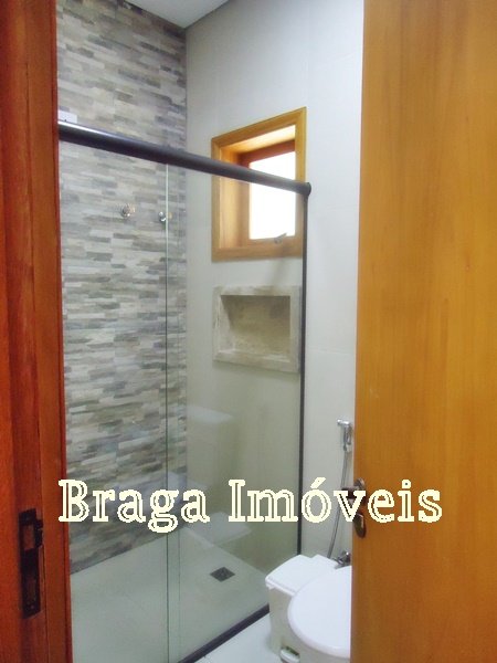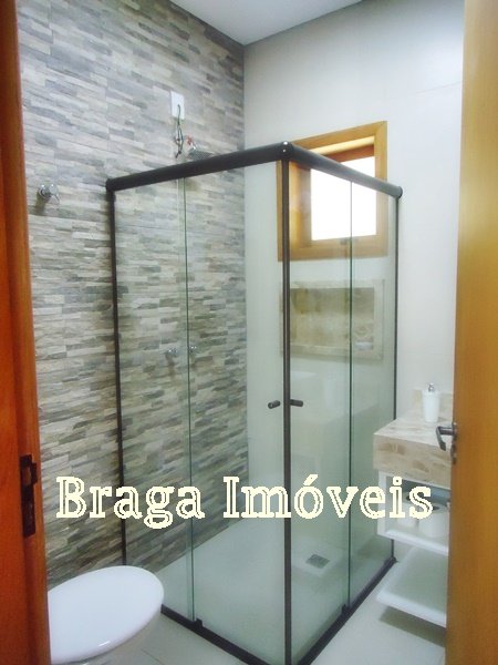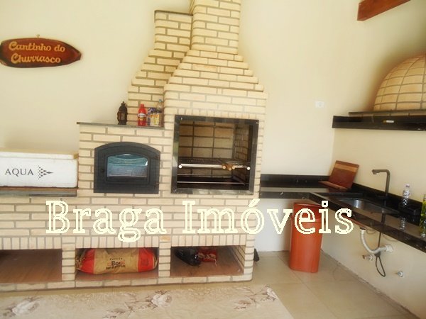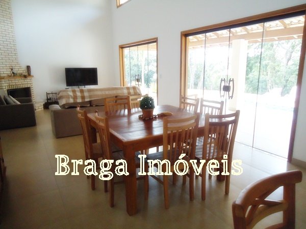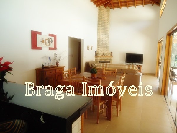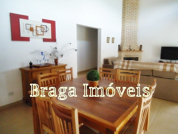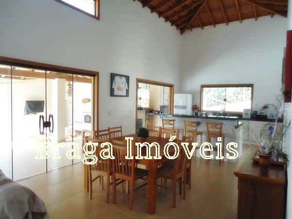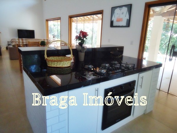Casa de alvenaria, com 3 dormitórios, sendo um suíte com box de vidro temperdo e com porta bacão de madeira com saída para a varanda, sala com pé direito alto, 2 ambientes com lareira, tudo com ventiladores de teto, a sala é conjugada com cozinha americana com uma ilha com fogão e forno acoplado, armários da planejados, pia de granito.